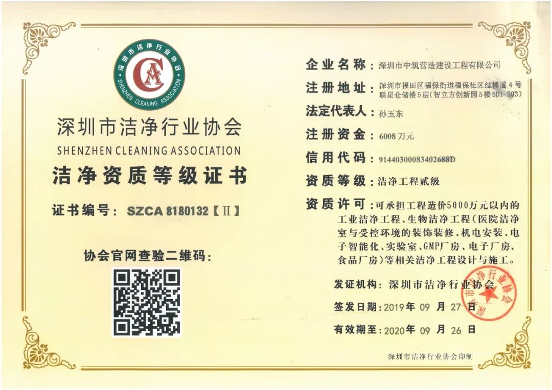 近日,深圳市中筑营造建设工程有限公司取得洁净工程贰级资质。